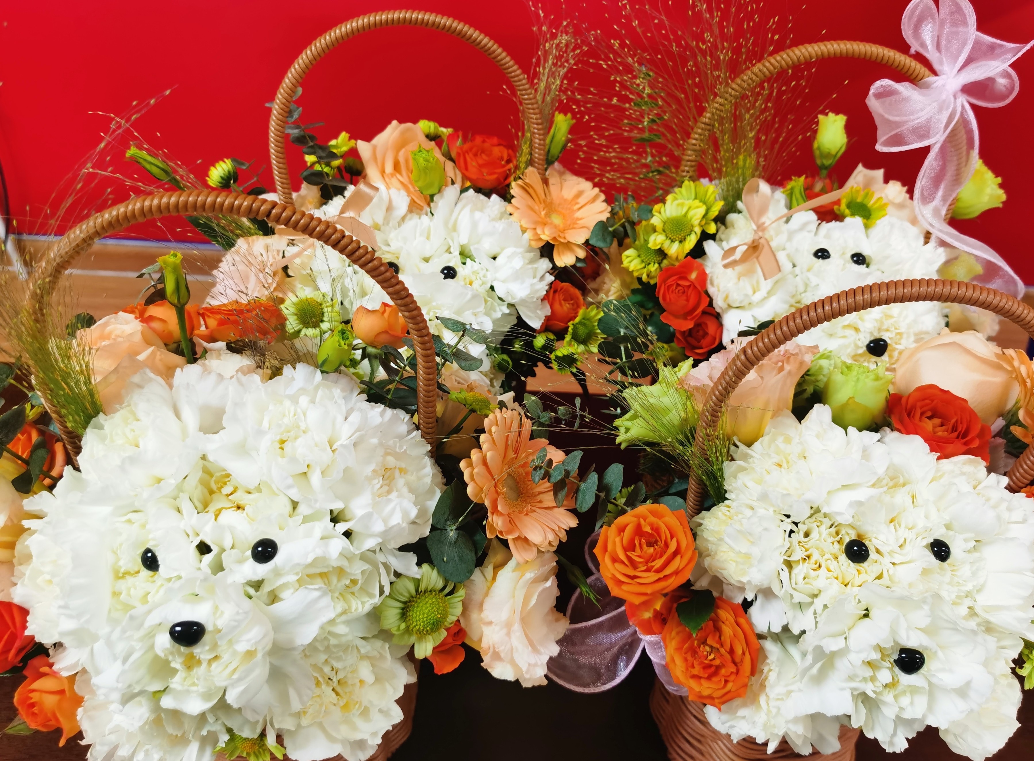 花藝老師先是簡單介紹了插花藝術(shù)的起源、發(fā)展、工藝等方面知識,隨后向大家介紹了此次藝術(shù)插花所使用到的花的種類。實踐環(huán)節(jié),在花藝老師的指導下,女職工手中白色浪漫的康乃馨逐漸呈現(xiàn)出萌萌的眼睛,嘟嘟的小嘴,在一雙雙巧手下,一個個可愛的小狗造型呼之欲出。大家發(fā)揮想象力和創(chuàng)造力,在主花的周圍整合造型,原本簡簡單單的花草在女職工們的手中變成美麗的花籃。大家看著自己親手制作的插花作品,感到滿滿的幸福和成就感。