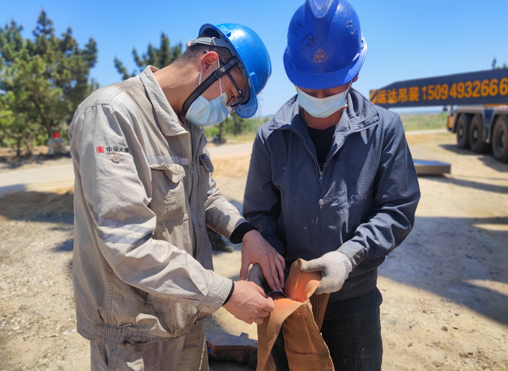 萊州一期技改現(xiàn)場(chǎng),監(jiān)察人員在吊裝前對(duì)吊帶進(jìn)行安全檢查(劉思洋/攝)