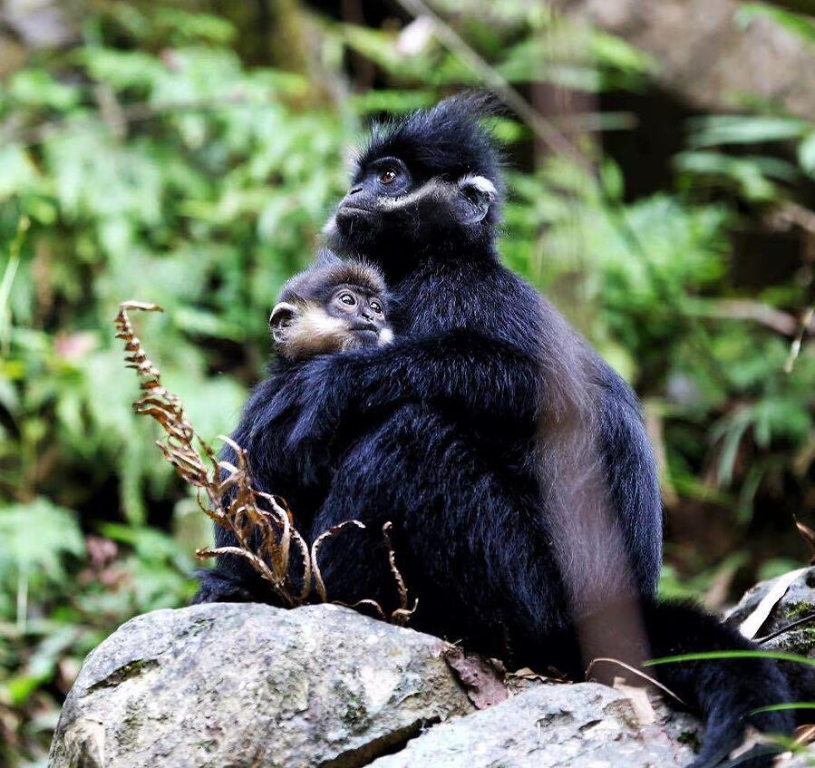 經(jīng)過(guò)長(zhǎng)途奔波,快艇行駛到貴州省沿河縣境內(nèi)的“麻陽(yáng)河國(guó)家級(jí)自然保護(hù)區(qū)”。山上傳來(lái)各種表達(dá)不同“情緒”的叫聲,在生態(tài)環(huán)保專業(yè)崗位奮斗8年之久的饒振祺朝密林中一指:“快看,那就是黑葉猴!發(fā)出‘嘎,嘎’的叫聲,說(shuō)明它們處在愉快的覓食狀態(tài)中;‘噢、噢’就是它們?cè)谏搅珠g攀援前進(jìn)的信號(hào)?!碧а弁?,巖石間、樹蔭深處不斷有黑葉猴迅捷地跳躍。它們頭頂冠毛蓬松,通體黑色,兩頰雪白的“絡(luò)腮胡”格外醒目,看起來(lái)像銀須飄飄的“小老頭”。有的黑葉猴懷里還抱著“金寶寶”——幼猴毛色金黃,隨年齡增大變黑。