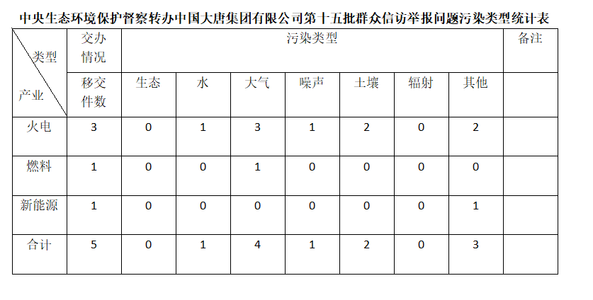 2025年6月21日,中央第七生態(tài)環(huán)境保護督察組向中國大唐集團有限公司移交第十五批群眾信訪舉報件,共計5件,其中來信舉報3件,來電舉報2件,涉及水問題1個、大氣問題4個、噪聲問題1個、土壤問題2個、其他問題3個。所有舉報件辦理工作已第一時間進入調查核實辦理程序,辦理情況將按照相關要求反饋督察組,并及時向社會公開。
